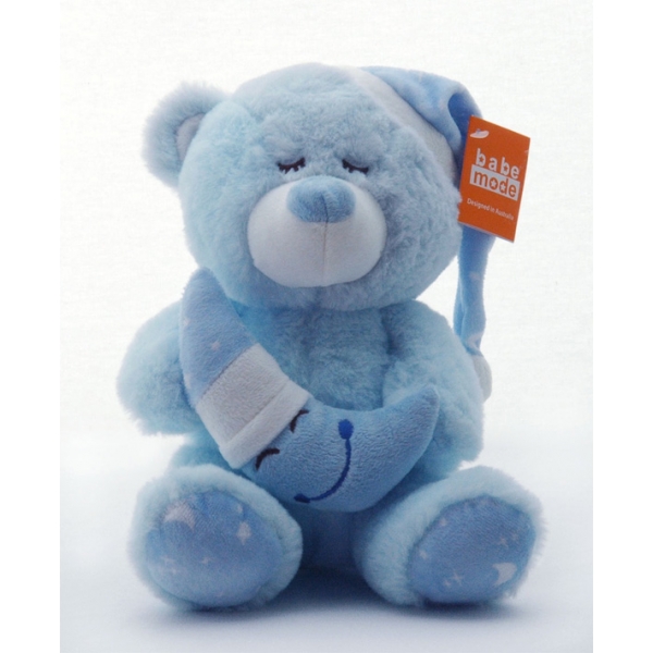 Soft Plush Moon Bear with adorable sleeping face. It is made from the softest fabric with stiched eyes and material nose. A great addition to gift baskets or just as a gift on its own.